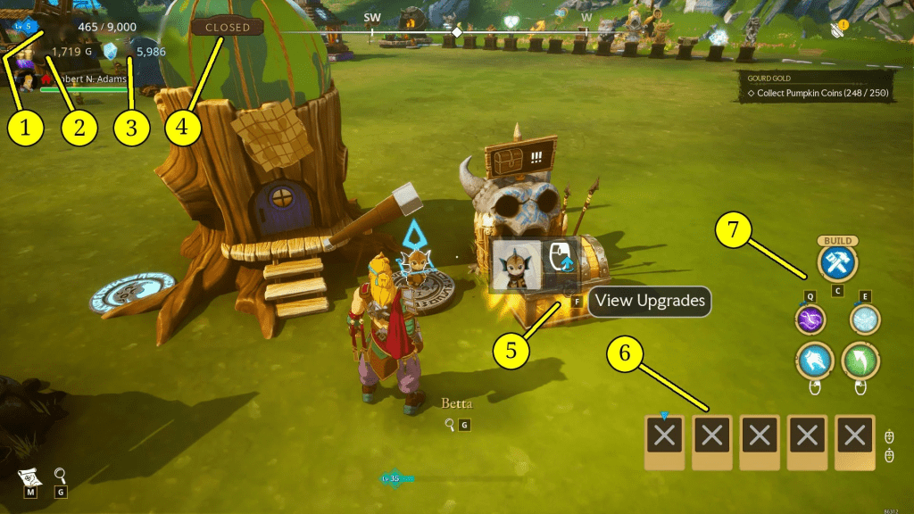 Cloudheim’ın oyun arayüzü (HUD), açık dünyada mı yoksa Odin Shell’de mi olduğunuza göre değişiklik gösterir. Önce normal savaş arayüzünü, ardından da Odin Shell’de göreceğiniz arayüzü tanımlayacağız.