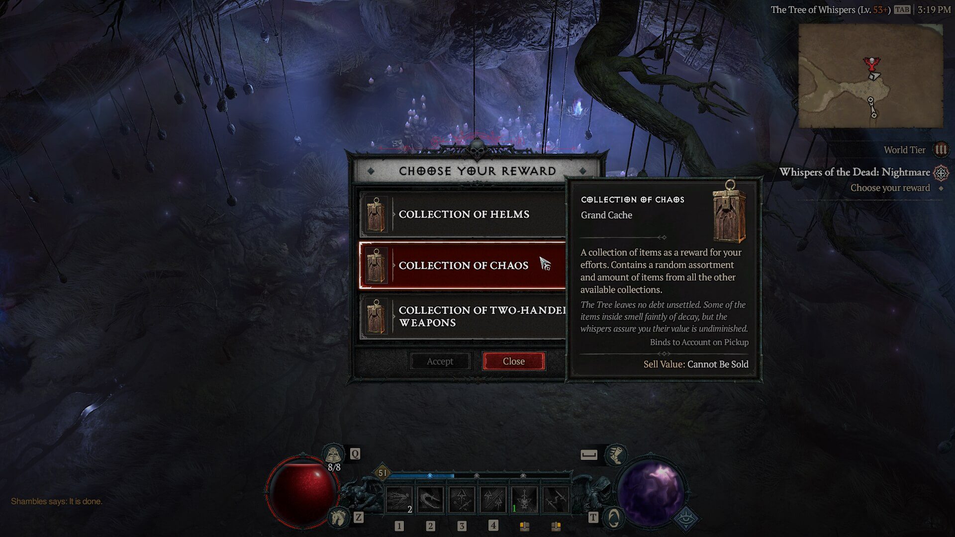 Göstergeniz dolduğunda, ödüllerinizi almak için Fısıltı Ağacı’na geri dönmelisiniz. Bu ödüller, bir miktar deneyim ve altınla beraber üç farklı koleksiyon kutusu seçme imkanı sunar. Koleksiyon isimleri, hangi eşyaların daha yüksek olasılıkla çıkacağına göre (örneğin Miğfer/Çizme Koleksiyonu) verilecektir, fakat yine de bir miktar şans unsuru bulunur. Daha iyi ödüller verilebilecek “Daha Büyük” koleksiyonlara da ulaşma ihtimaliniz bulunmaktadır. 3. veya 4. Dünya Seviyesinde olduğunuz zaman, bu koleksiyonlar Kabus Zindanlarını çalıştırmada gerekli olan Mühürleri de verebilir.