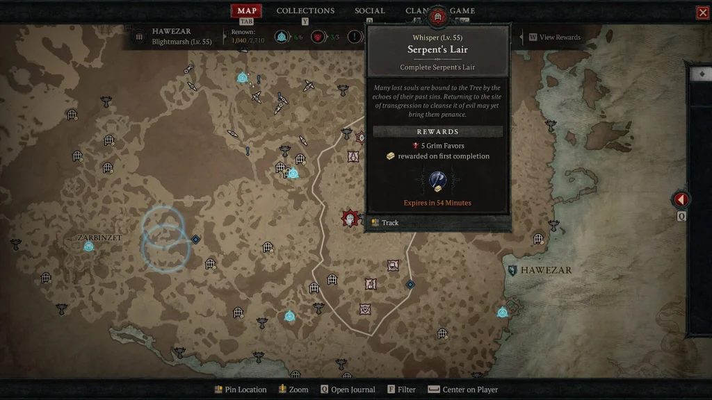 Diablo IV’teki Ölülerin Fısıltıları, ilk karakterinizin ana hikaye görevini tamamladıktan hemen sonra ulaşabileceğiniz tekrar edilebilir bir Öncelikli Görevdir. Bu görevi ilk olarak Hawezar bölgesindeki Fısıltılar Ağacı ile konuşarak edinmeniz mümkündür (burada bu durumu belirten bir Öncelikli Görev bulunmaktadır). Bu görev, harita ekranınızın en alt kısmında bir “Korkunç Lütuflar” göstergesi oluşturacaktır. Bu gösterge, on bölüme ayrılmış olup, Fısıltılar olarak adlandırılan harita hedeflerini yerine getirerek doldurulur. Bu hedefler, belirli bir süreyle sınırlıdır, ancak haritada her zaman birlikte birden fazla hedef bulunabilir.