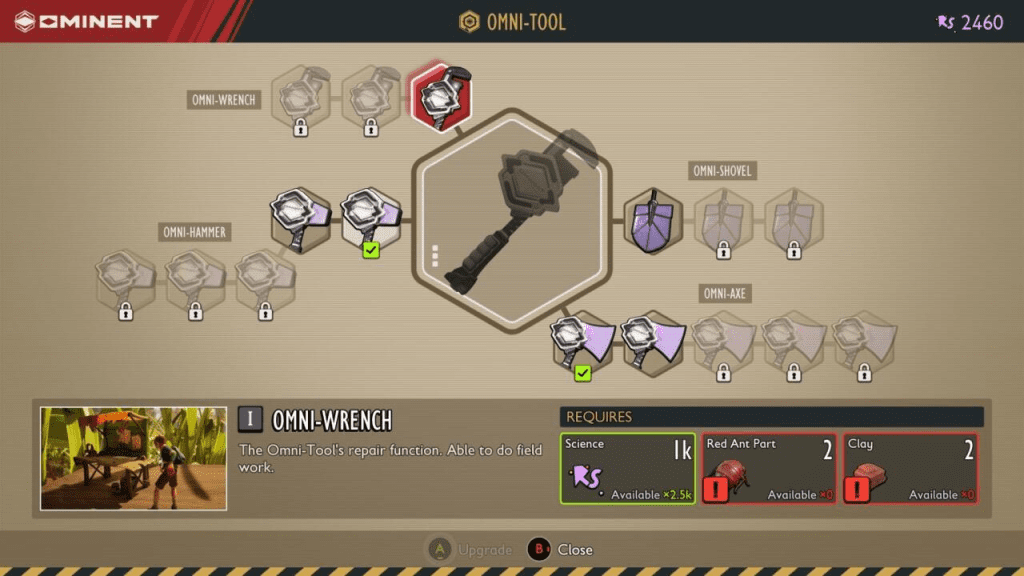 Omni-Tool üzerinde ilk yükseltmeyi gerçekleştirmek için Ranger İstasyonu terminali ile etkileşimde bulunun. Zaten temel balta işlevine erişiminiz var, fakat bu, İngiliz anahtarı, kürek ve çekiç gibi üç yeni alet fonksiyonu eklemenizi sağlıyor. Her bir alet çeşidinin daha fazla kullanım için gerçekleştirebileceğiniz birkaç tane yükseltmesi bulunmaktadır.