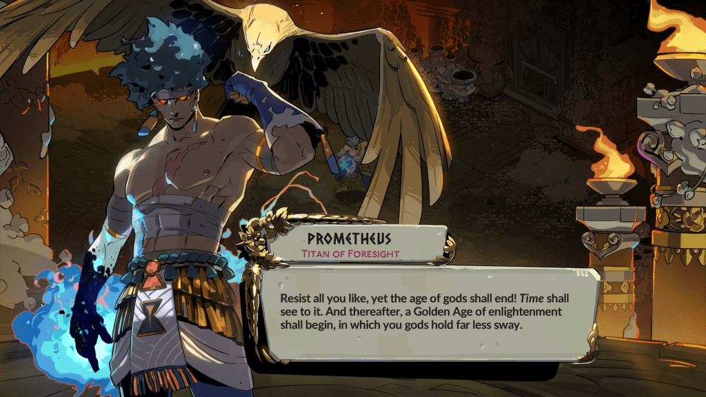 Prometheus ile ilgili bir detayı vurgulamak istiyorum. Efsanesini biliyorsanız, aslında bir dağın zirvesinde zincirlenerek bir kartalın iç organlarını yemesi nedeniyle sonsuza dek lanetlenmiştir. Öncelikle fark etmemiştim ama Prometheus’un karnında büyük bir yara izi ve bir bandaj bulunuyordu. Bir boss olarak, yanında bir kartal silah arkadaşı vardı ve ateşi de kullanıyordu (insanlığa ateşi veren kişi olduğundan bu oldukça mantıklıydı).