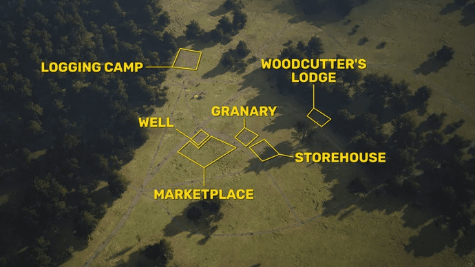 Odunculuk Kampı ve Oduncu Kulübesi dışındaki tüm yapılar, köyünüzün ideal konumuna yakın bir yerde olmalıdır. Oduncu Kampı ormanların yanına kurulmalıdır, fakat herhangi bir yaban hayvanına çok yakın olmamalıdır. Kişisel olarak, gerektiğinde hızlı bir şekilde erişebilmek için erken bir dönemde bir Oduncu Kulübesi inşa etmeyi tercih ediyorum, ancak bu zorunlu değildir. Eğer şimdi bir tane kurmayı düşünüyorsanız, mümkünse Oduncu Kampınızdan ayrı bir ormanlık alanda konumlandırmalısınız.