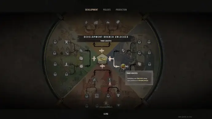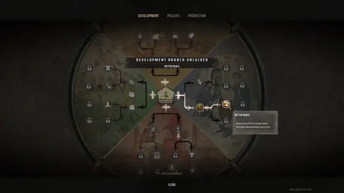 Şimdi, yukarıdaki köy ismine tıklayarak Geliştirme teknoloji ağacını yeniden açın ve bu sefer, önceki seferde açtığınız Ticaret Lojistiği teknolojisinden gelen Geliştirme Yükseltmesi olan Daha İyi Anlaşmalar’ı seçin.