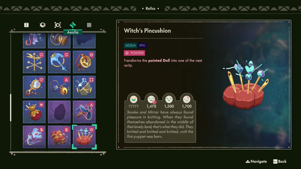 Cadı İğne Yastığı, “Sivri” etkisine sahiptir ve bu, bir Bebeği anında bir üst nadirlik seviyesine yükseltir. Bu sayede dönüşüm işlemi sırasında sırt çantanızı fazla eşya ile doldurma gerekliliğinden kurtulursunuz.