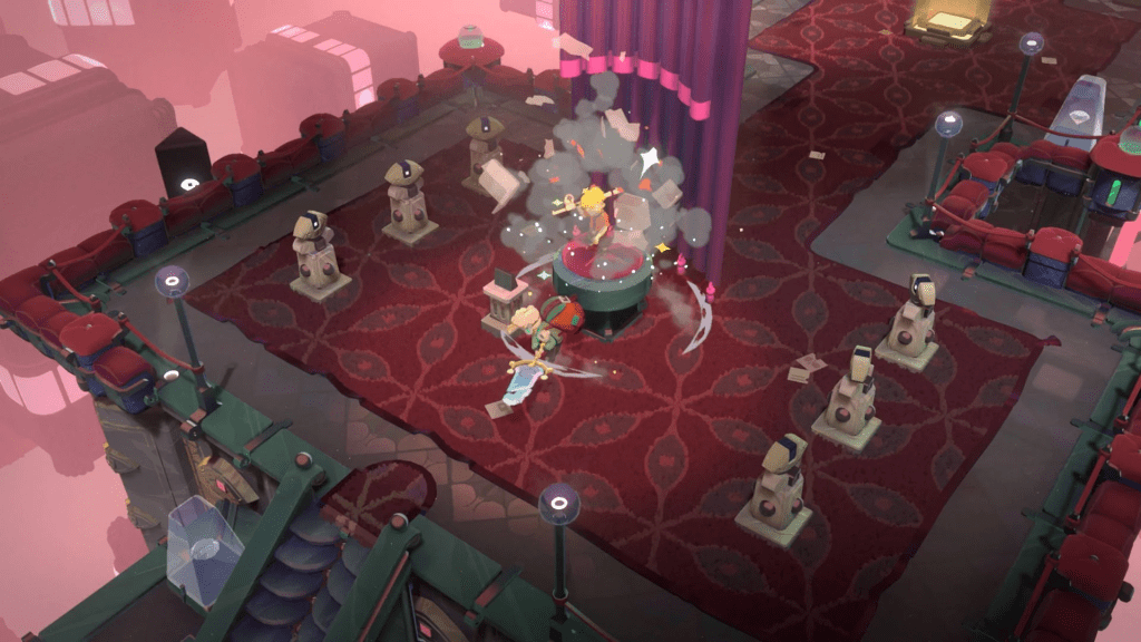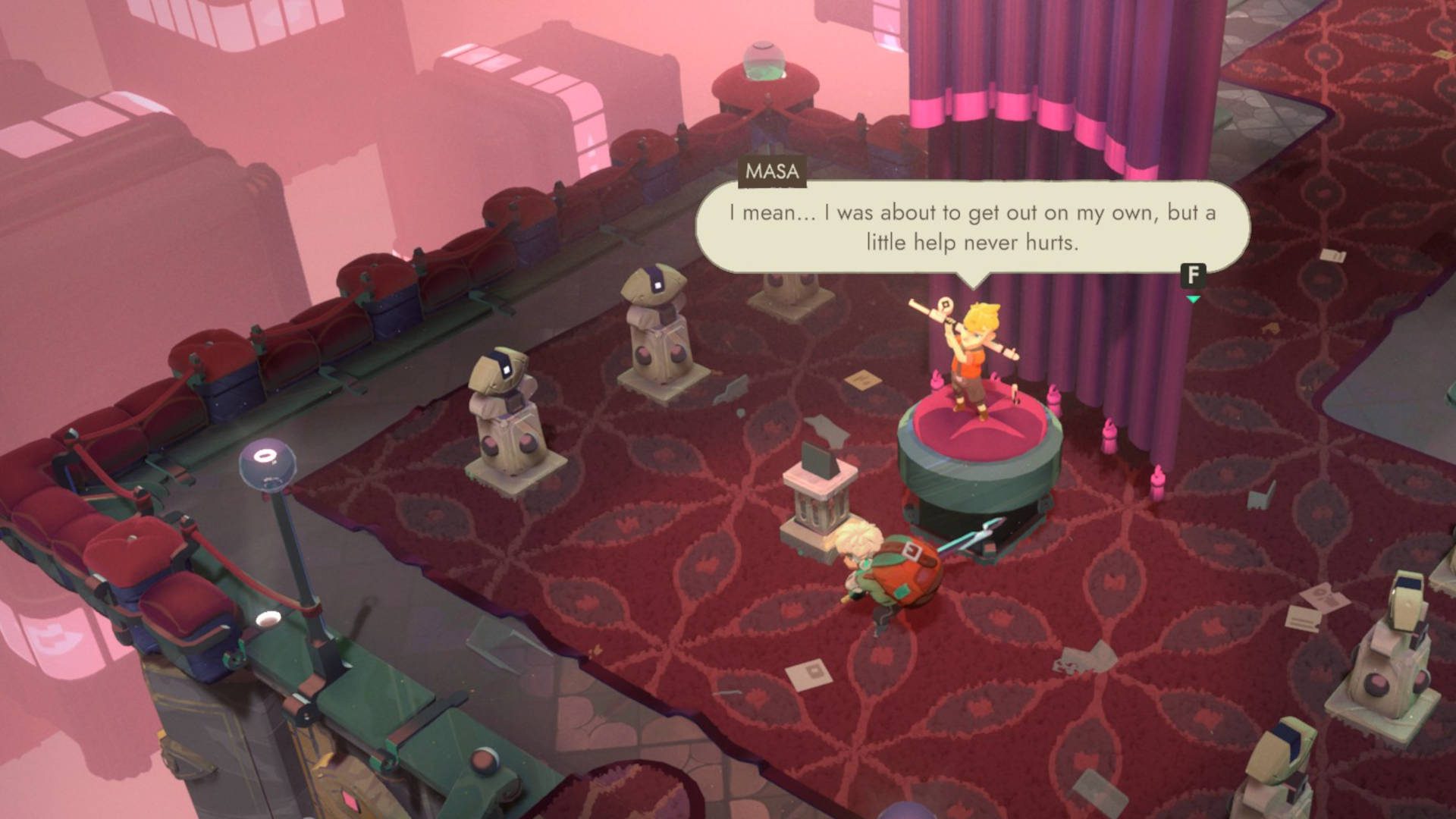Hazine Salonları’na girdiğinizde ilk defa Masa ile karşılaşmaya başlayacaksınız; bu karakter, ilk Moonlighter oyunundan aşina olduğunuz ancak şimdiye dek görmediğiniz biri. Cam bir hapiste kapana kısılmış durumda ve oradan çıkabilmesi için sizin desteğinize ihtiyaç duymaktadır.