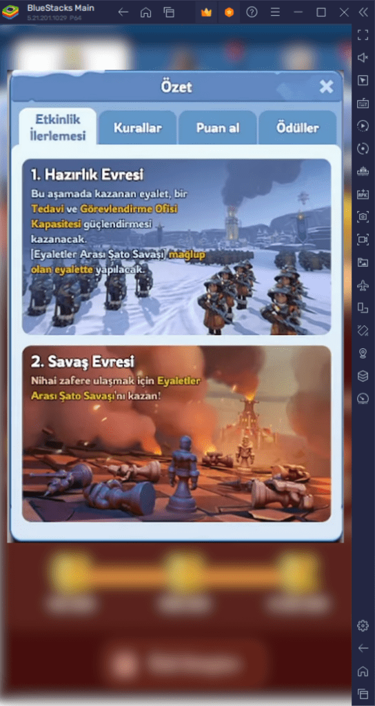 2. Hazırlık Evresi: Toplam beş gün süren bu dönem içerisinde bina yükseltimi, birlik eğitimi, canavar avcılığı ve kahraman geliştirme gibi günlük görevleri tamamlayarak puan kazanılır. En yüksek puanı elde eden eyalet, Savaş Evresi için avantajlar kazanır.